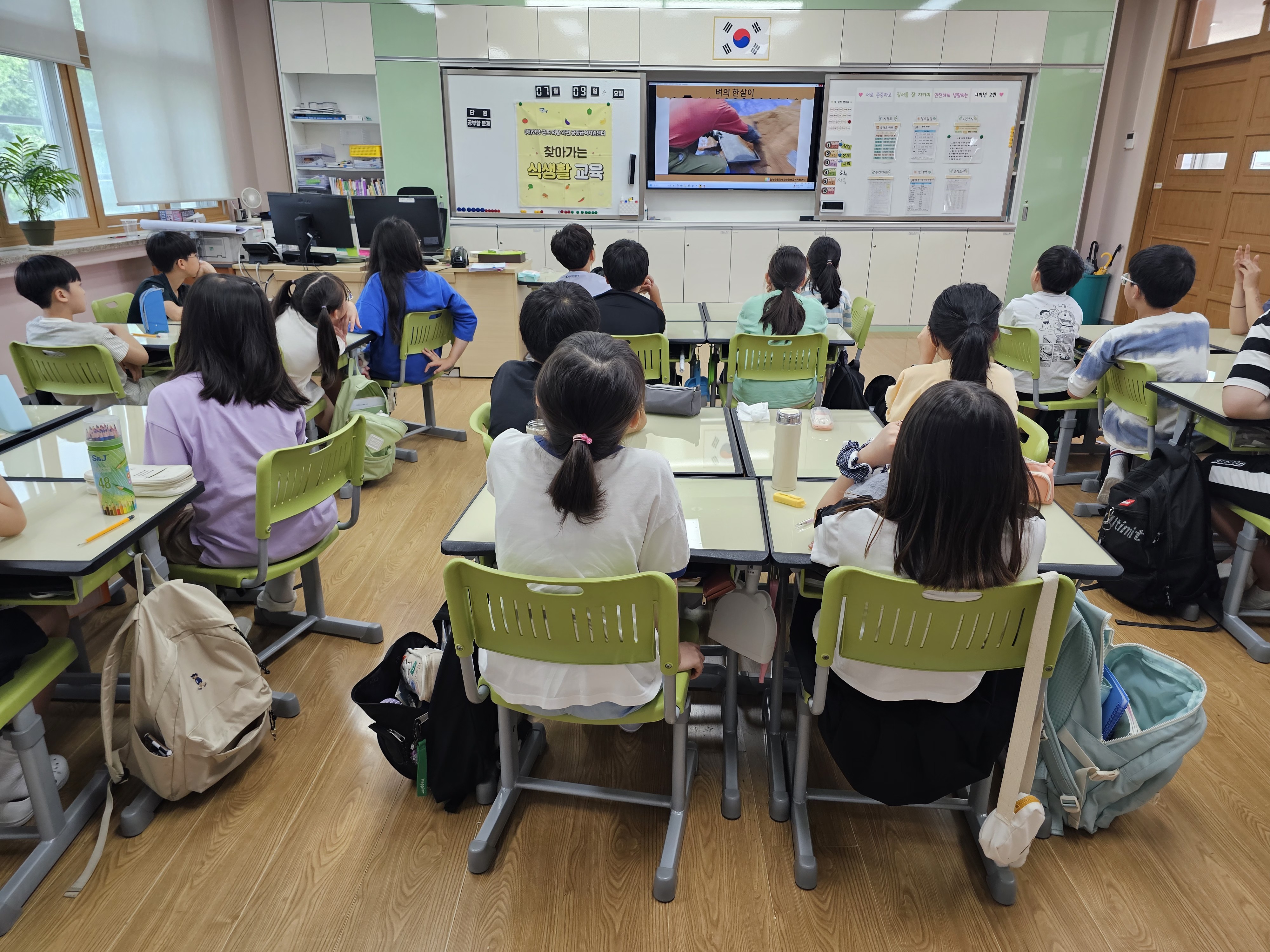 1.2반 수업, 아이들의 수업 태도가 좋고, 대아미에서 전통 농사 짓는  영상을 신기하고 재미있게 봄.