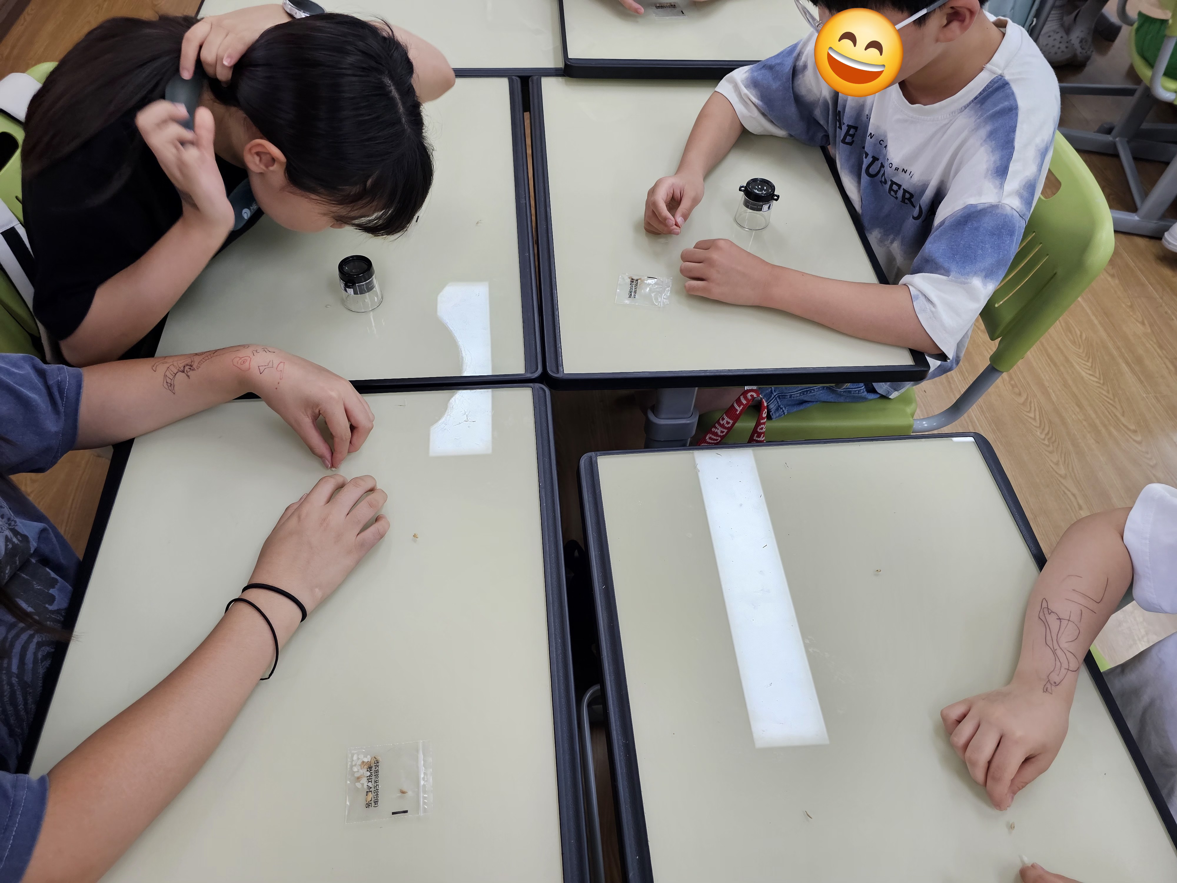 - 쌀 알아보기 (볍씨관찰: 직접 왕겨를 벗긴 현미와 백미를 루페를 통해 관찰한다.)