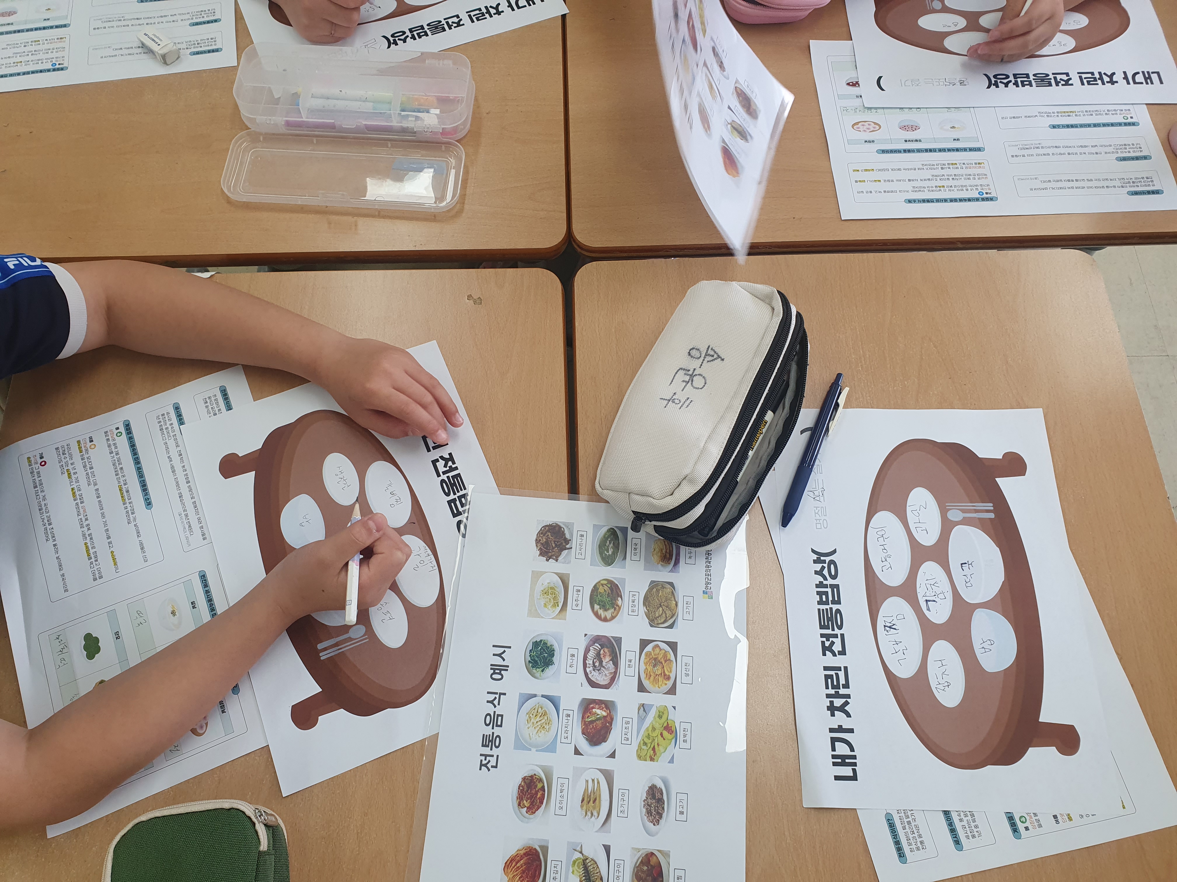 나만의 전통밥상 차리기 활동지를 작성할때는 급식메뉴에 있던 음식을 3가지 함께 적어보고 활동하였더니 학생들이 쉽게 활동지를