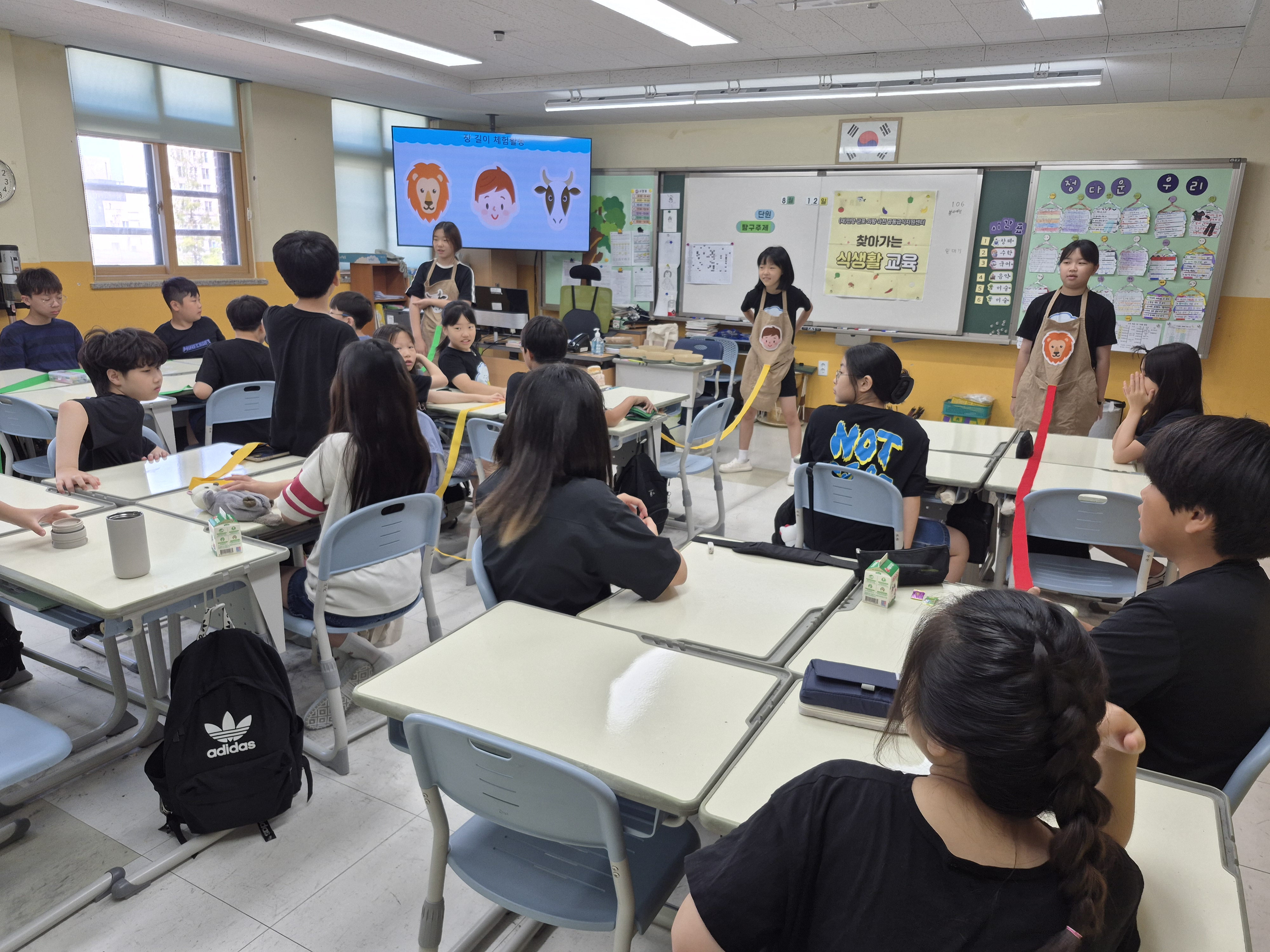 육식위주의 식생활이 심각한 기후변화에 영향을 미친다는 것을 알게 되어 오늘부터 저탄소 식생활을 실천하기 위해 육식을 줄이고 식물성 단백질의 대표적인 식품인 검정콩 맛보기체험을 통해 처음으로 경험한 볶음콩에서 여러가지 맛을 느낄수 있었다고 맛을 발표하며 실천을 다짐하는 학생이 기특하였다.