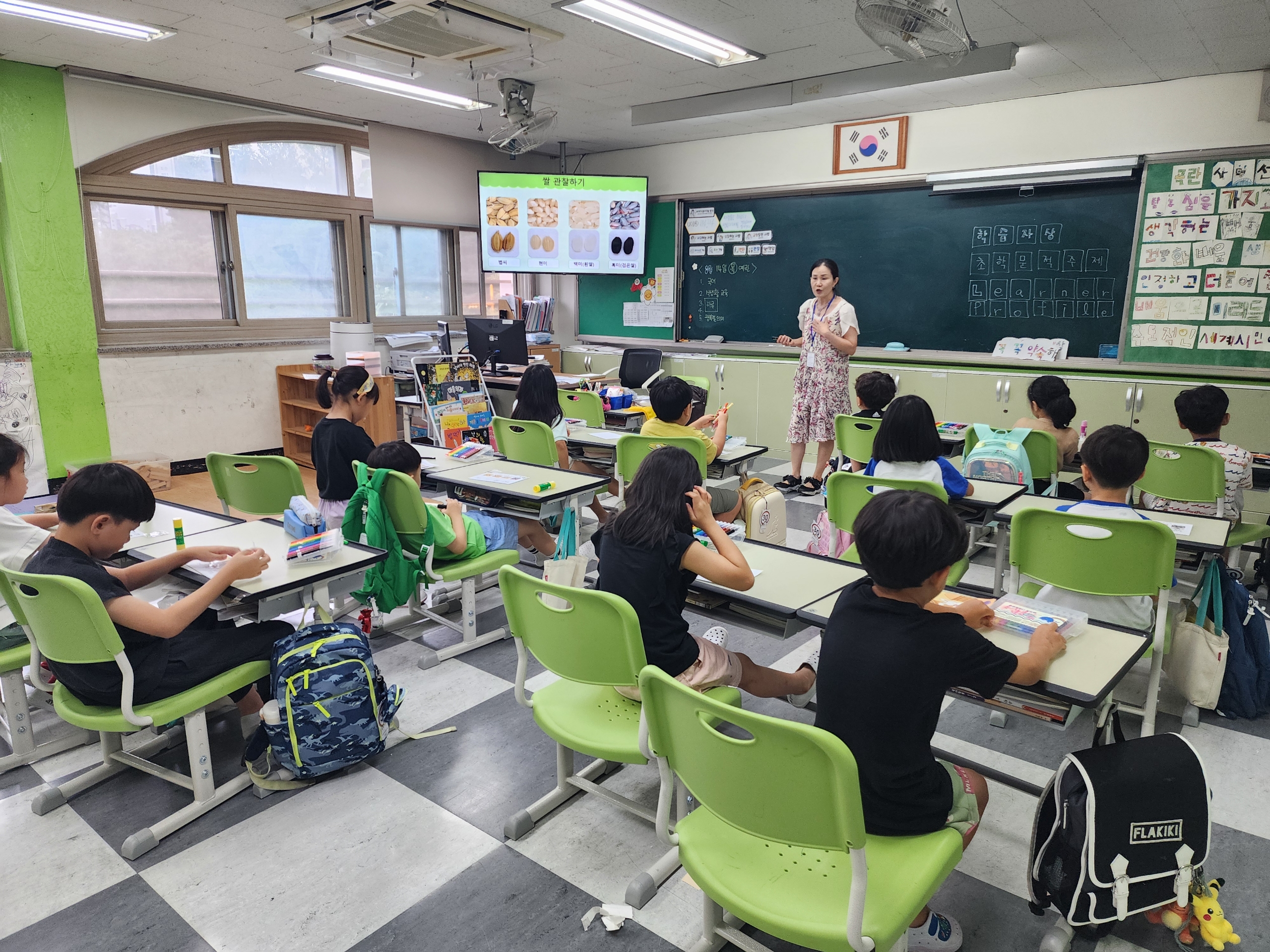 한 알의 볍씨가 봄부터 가을까지 잘 자라 쌀이 되어 우리의 밥상에 오른다는 것을 알아보았어요.  벼가 잘 자라기 위해서는 햇빛, 비, 바람, 비료  그리고 농부의 정성이 필요함을 알았어요.  볍씨, 현미, 백미, 흑미를 자세하게 관찰 후 활동지에 붙여보았어요.  현미 뻥튀기에 어떠한 자극적인 맛이 없음에도 아이들은 고소한 맛이 나요~, 미숫가루 맛이 나요 등등 맛있게 먹고 더 먹고 싶어 하였습니다.  할아버지가 농부라며 할아버지에게 감사 카드를 쓰는 예쁜 마음의 학생도 있었습니다.