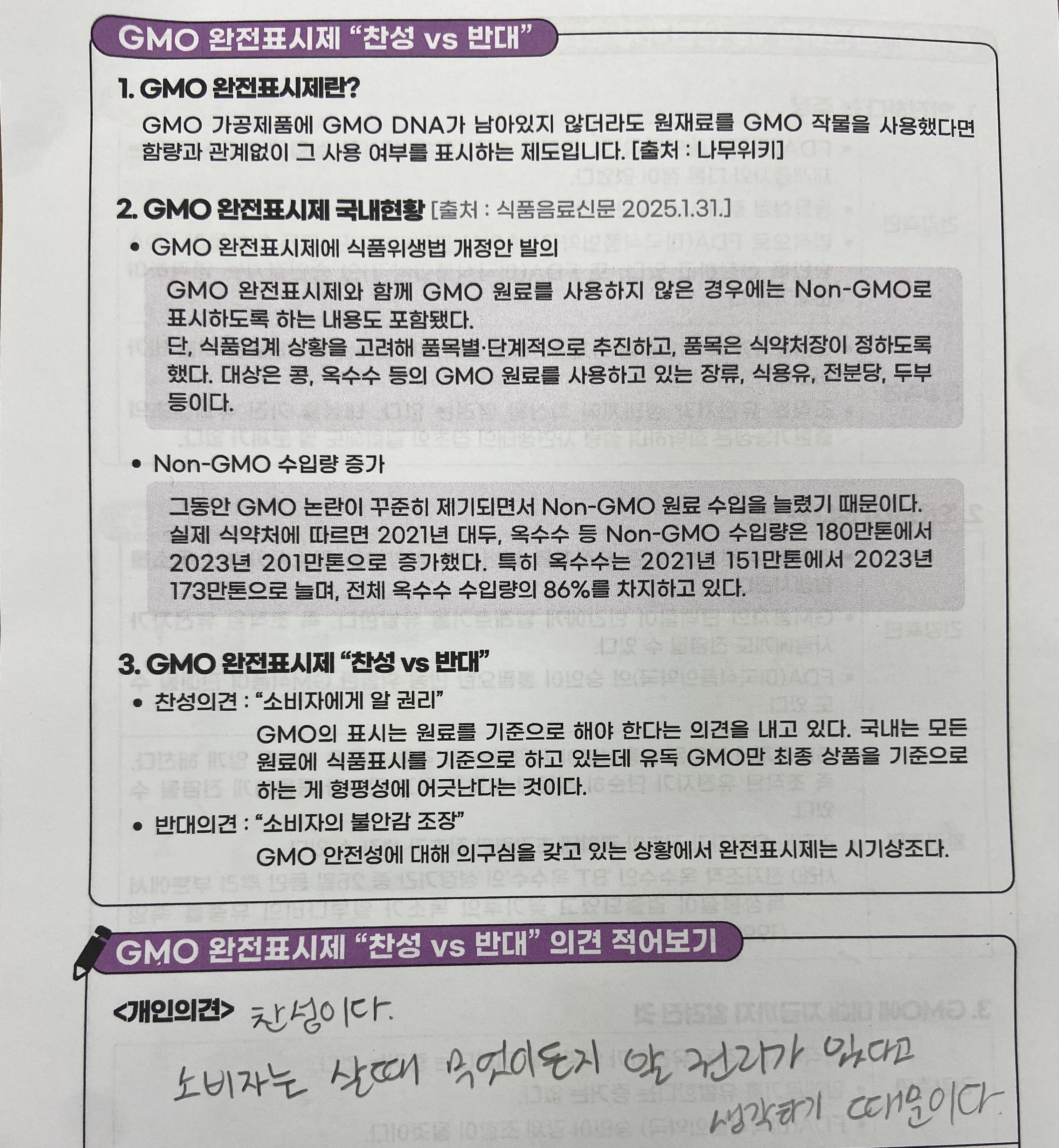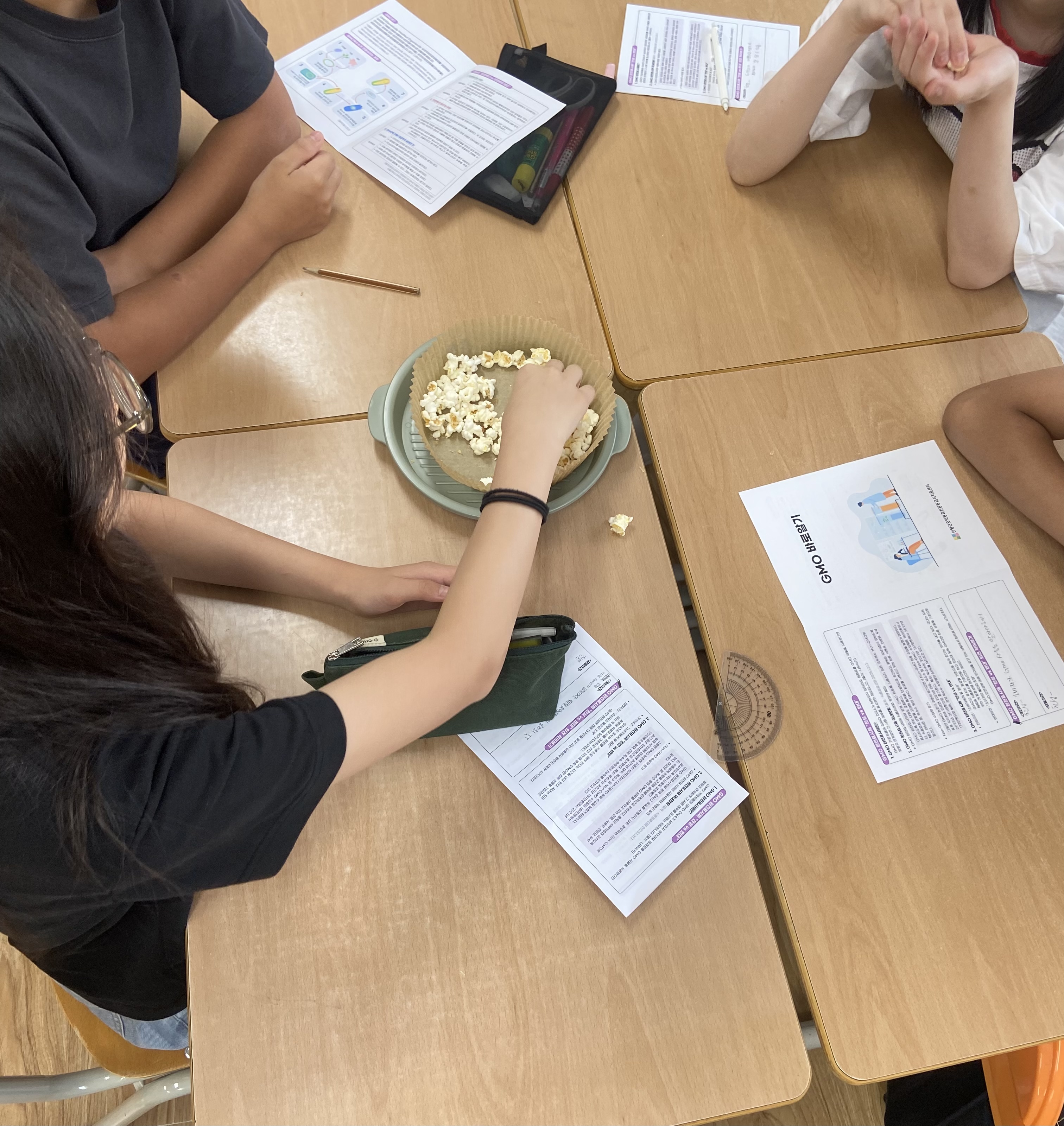 GMO에 대해 알아보고 GMO식품 안전성 논란에 대해 생각해 보았습니다. GMO식품을 구분하기 위해 GMO식품 완전표시제가 시행되는 것에 대해 모둠별로 토론을 해보고 발표해 보며 건강한 식생활을 위해 내가 먹는 먹거리에 대해 다시 한번 생각해보는 시간을 가졌습니다. Non-GMO옥수수를 관찰하고 팝콘을 맛보았습니다.