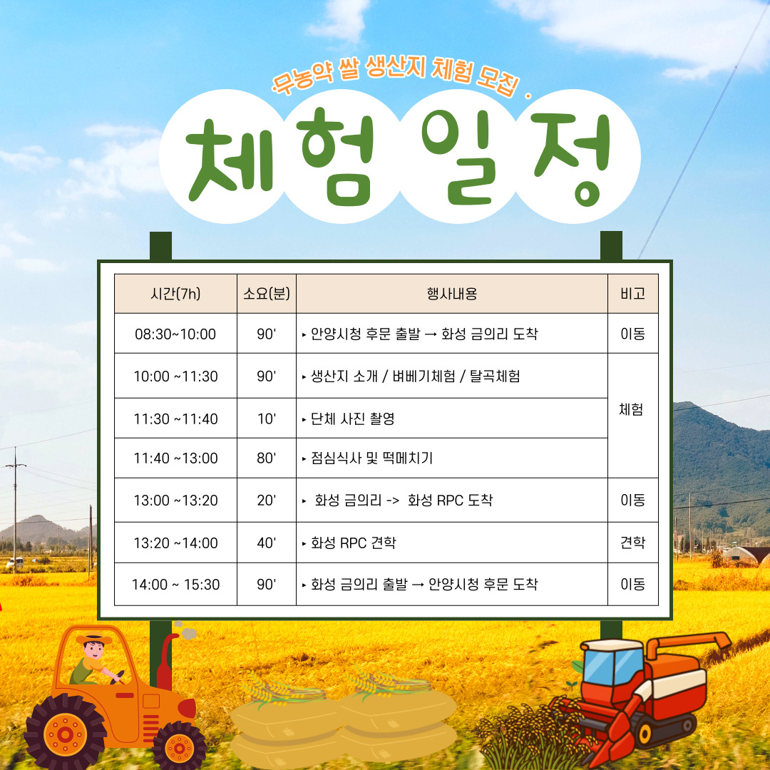 학교급식에 공급되는 무농약 쌀 생산지인 화성 농가를 방문하여 벼베기 체험 및 미곡종합처리장(RPC) 견학을 통해 우리 쌀의 소중함과 농촌.농업의 가치를 알아보는 체험활동을 진행하오니 많은 신청바랍니다.